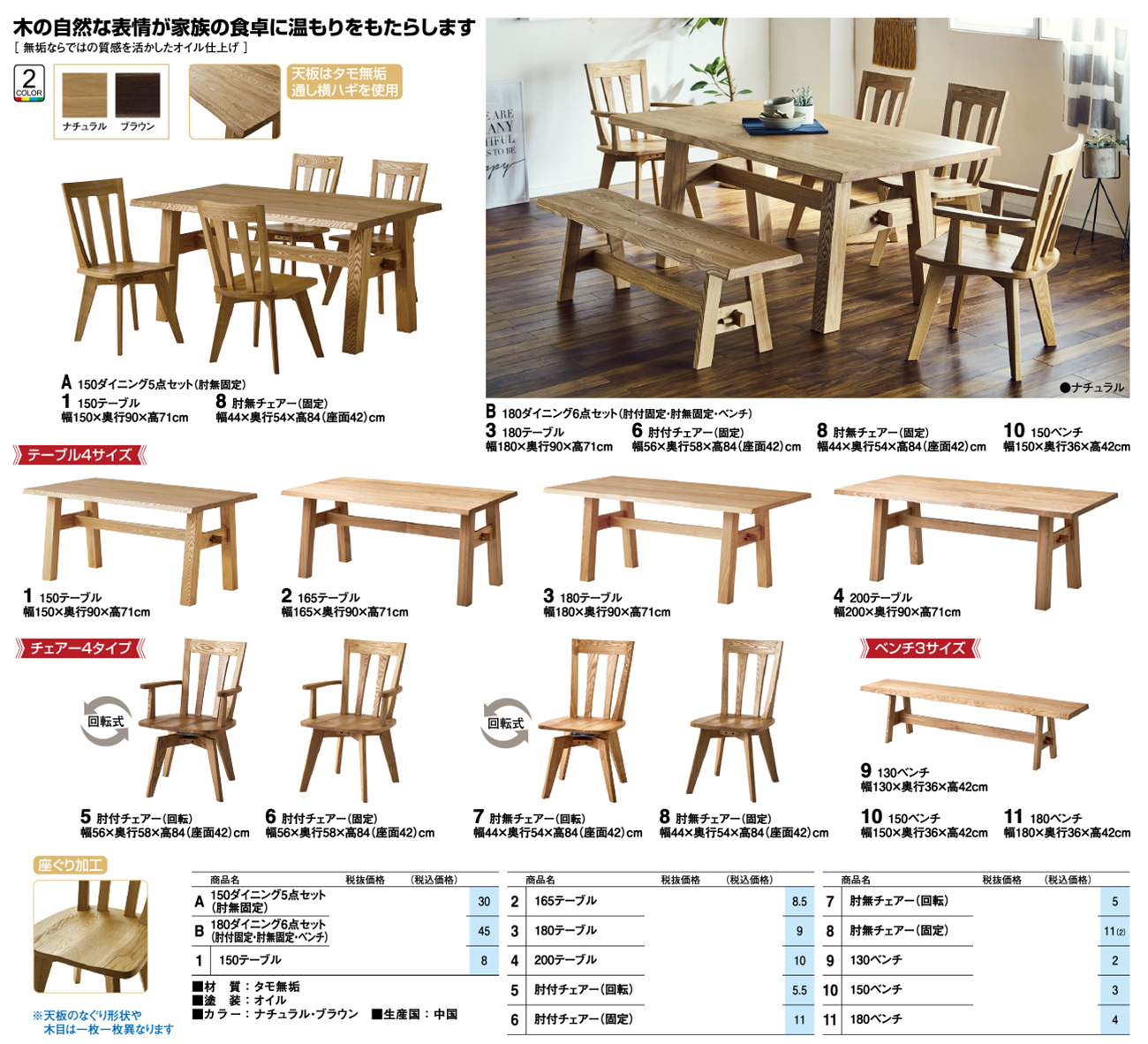 • 180ダイニング6点セット (肘付固定·肘無固定·ベンチ) (AC固定2·C固定2·150B) 税抜280, 160円 (税込308, 176円)