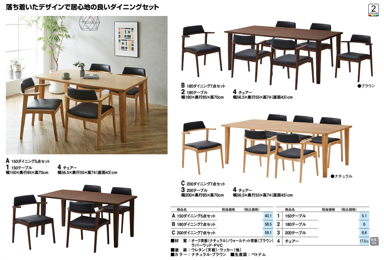 • 180ダイニング7点セット 税抜166, 400円 (税込183, 040円)