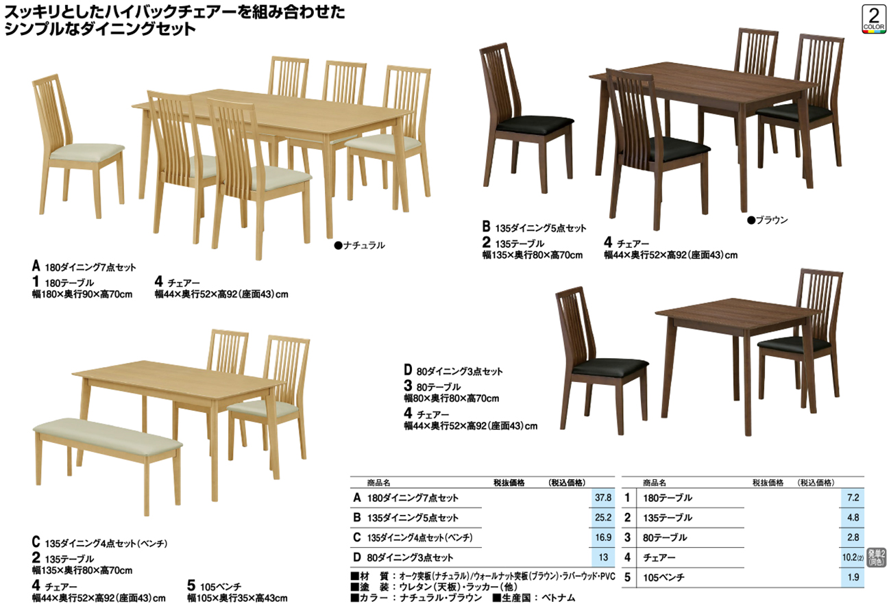 - 180ダイニング7点セット 税抜133, 600円 (税込146, 960円)