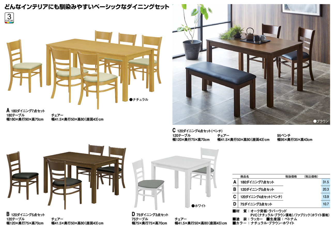 - 75ダイニング3点セット 税抜38, 400円 (税込42, 240円)
