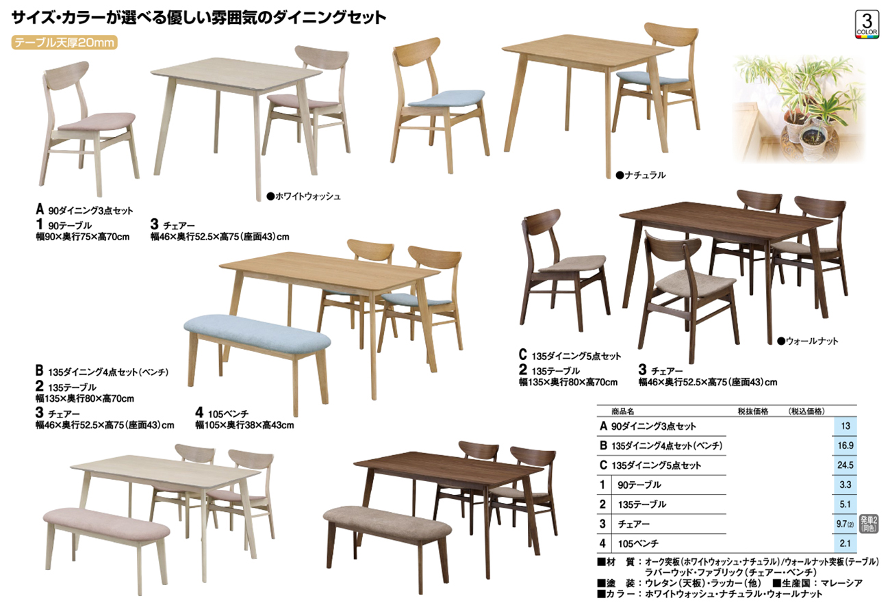 • 90ダイニング3点セット 税抜52, 960円 (税込58, 256円)