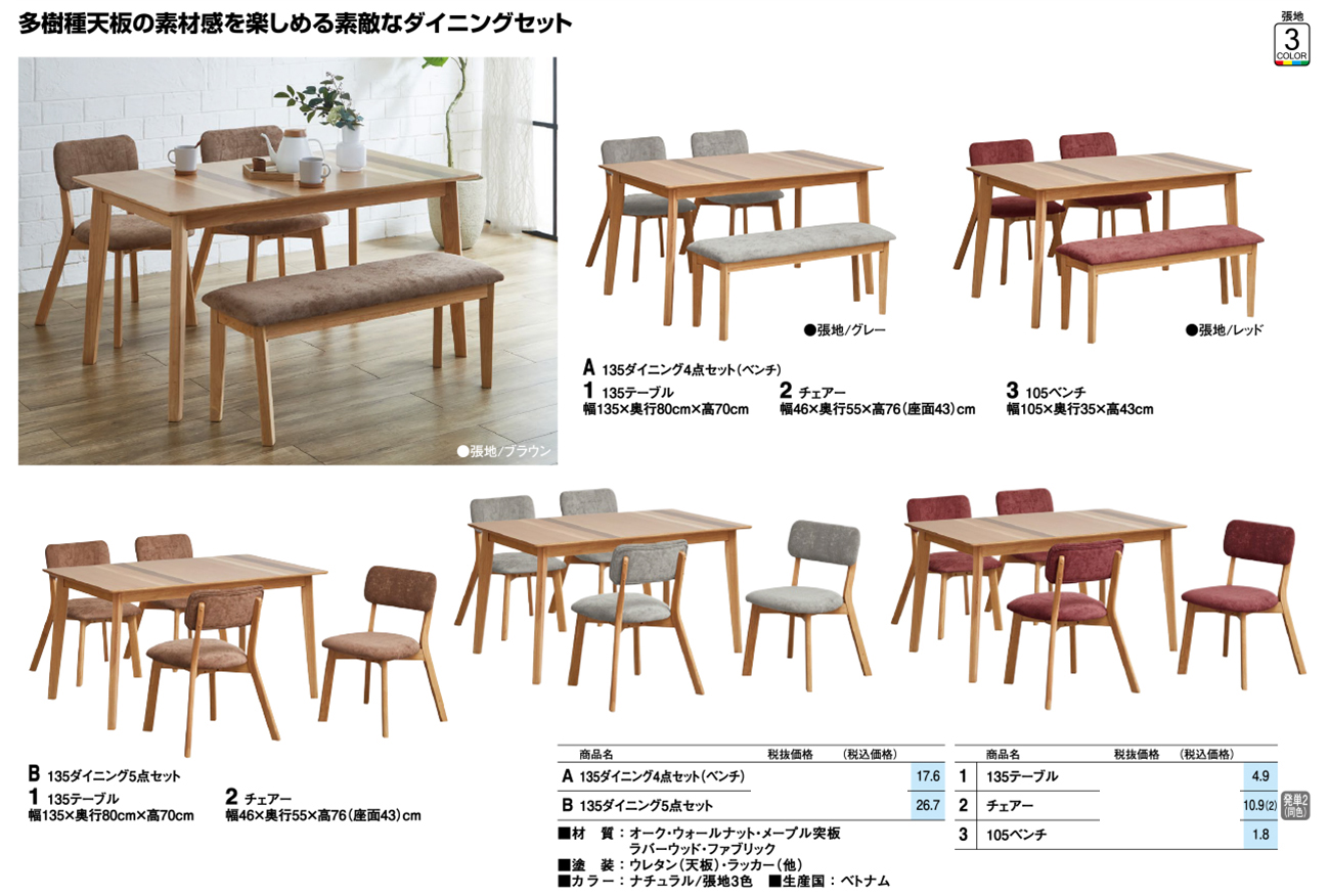 - 135ダイニング5点セット 税抜96, 800円 (税込106, 480円)