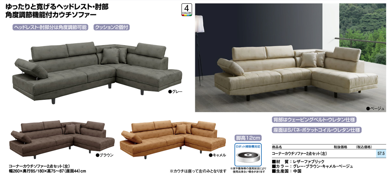 • コーナーカウチソファー2点セット(左) 税抜134, 720円 (税込148, 192円)