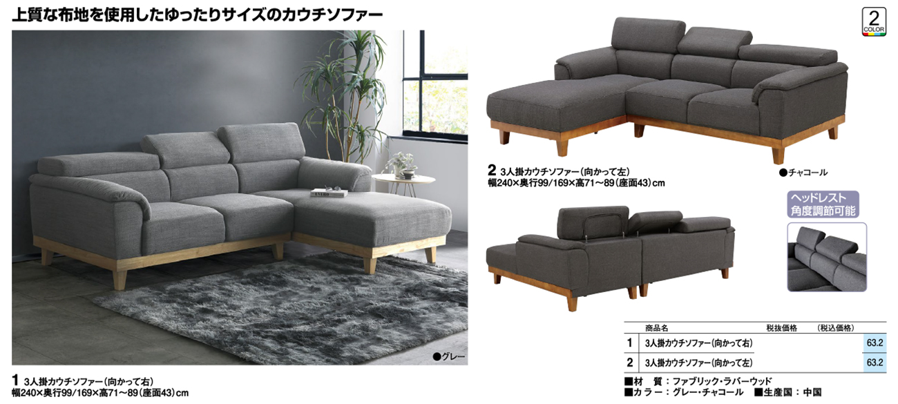• 3人掛カウチソファー(向かって右) 税抜189, 360円 (税込208, 296円)