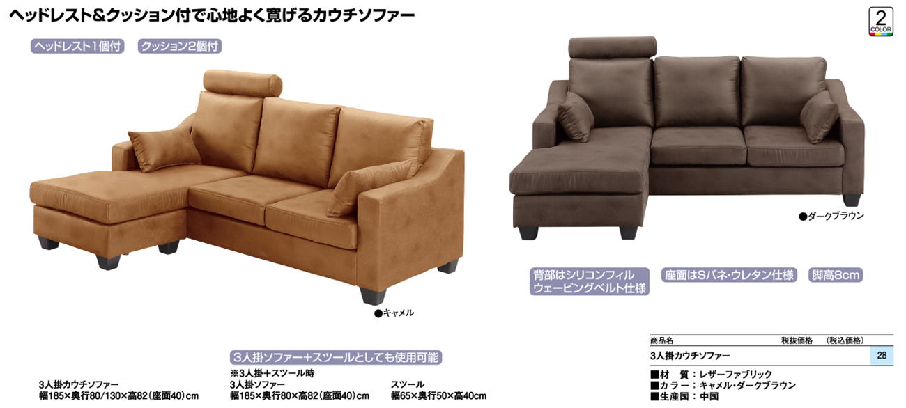 - 3人掛カウチソファー 税抜69, 360円 (税込76, 296円)