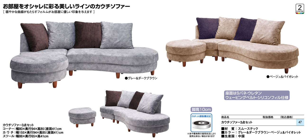 - カウチソファー3点セット 税抜121, 360円 (税込133, 496円)