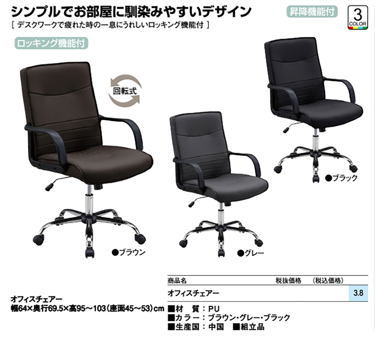 - オフィスチェアー 税抜22, 400円 (税込24, 640円)