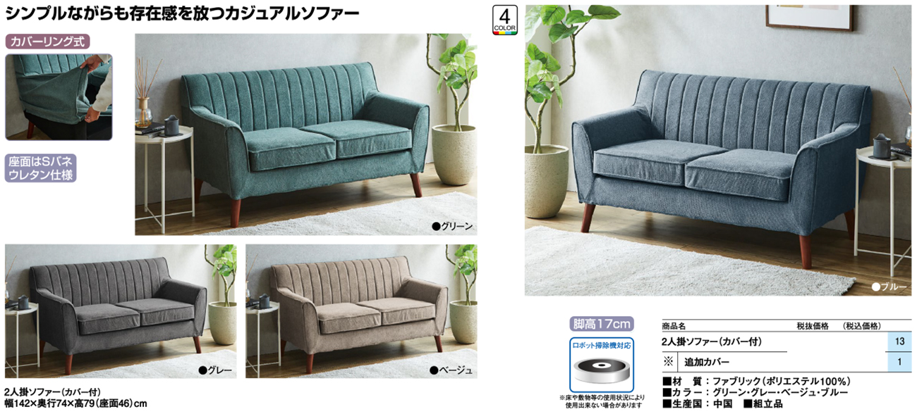 - 2人掛ソファー(カバー付) 税抜44, 000円 (税込48, 400円)