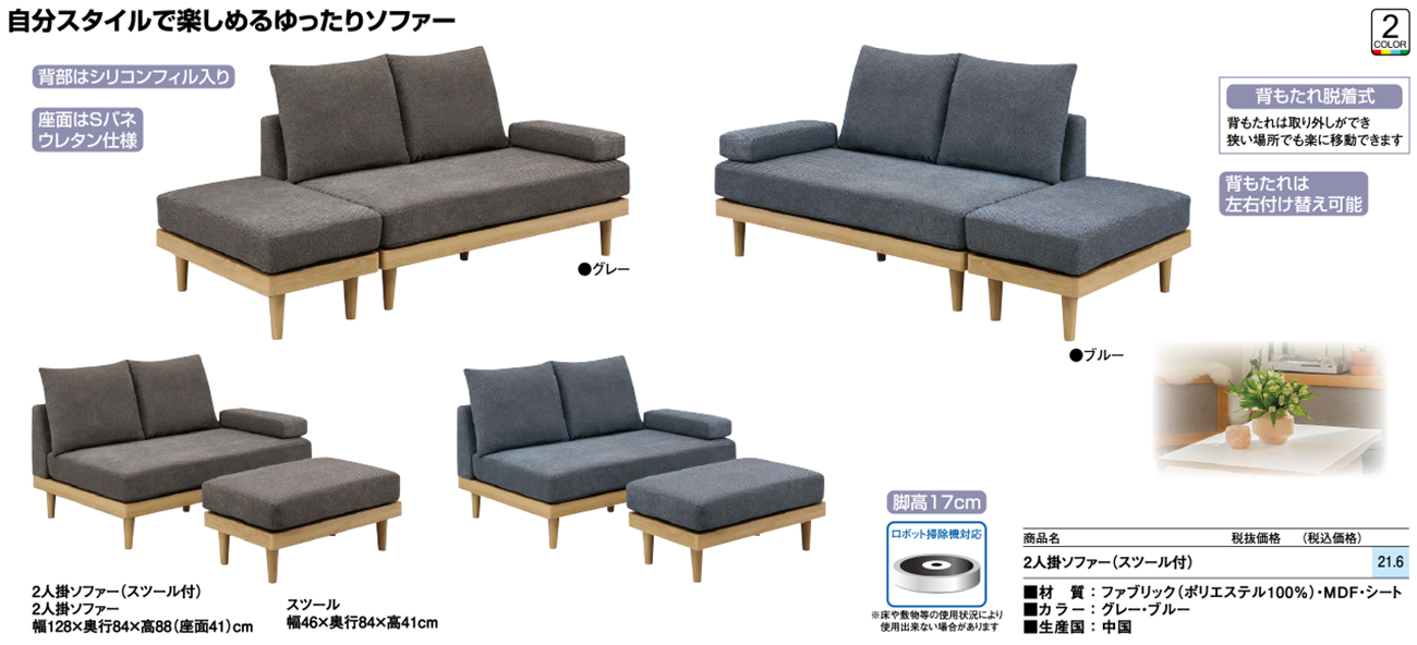 - 2人掛ソファー(スツール付) 税抜68, 000円 (税込74, 800円)