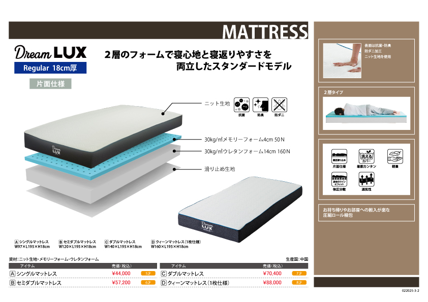 - A.シングルマットレス 参考価格 44,000 円(税込)